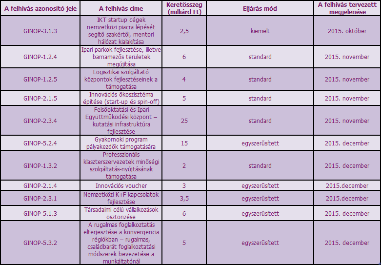 Az idei évben várhatóan az alábbi pályázati felhívások fognak még megjelenni: